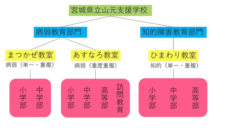 本校は、昭和49年4月、国立療養所宮城病院(現「独立行政法人国立病院機構宮城病院」)の病棟を教室としていた、山元町立山下小・中学校分教室から、宮城県立西多賀養護学校山元分校として県立に移管され、その後、昭和53年4月に宮城県立山元養護学校として独立開校しました。国立療養所宮城病院に入院中の、結核や気管支喘息等の疾患を持つ義務教育学齢の児童生徒を対象とした、「病院隣設」の病弱(身体虚弱を含む)養護学校でしたが、平成17年度からは知的障害教育部門を新たに設け、県内初の複数の障害に対応する学校として再スタートしました。さらに平成18年4月からは新たに高等部を開設しました。平成21年4月には学校教育法の一部改正に伴い「養護学校」から「特別支援学校」へと位置づけられました。平成29年4月からは学齢超過者の訪問教育(3年間)も開始され現在に至ります。地域の小・中学校や高等学校と交流及び共同学習を実践し、インクルーシブ教育システム構築を推進しています。また、地域の特別支援教育センターとして、特別支援教育の啓発や教育相談などに取り組んでいます。
