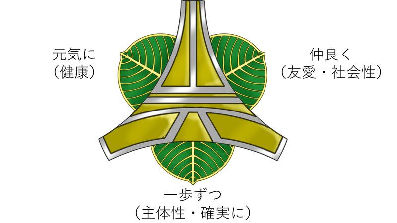 また、3つの葉は校訓である「元気に(健康)」、「仲良く(友愛・社会性)」、「一歩ずつ(主体性・確実に)」を表しています。