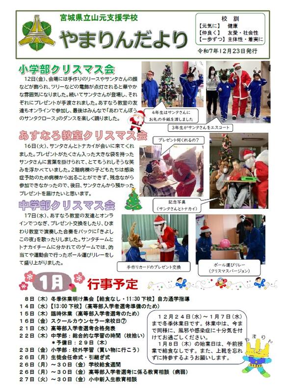 ホーム学校紹介 学校長挨拶学校の概要知的障害教育部門 小学部ひまわり教室中学部ひまわり教室高等部ひまわり教室病弱教育部門 あすなろ教室学校の沿革学校評価学校安全学校いじめ防止基本方針学校施設行事予定入学を希望する方へ学校見学会について地域支援 地域支援部の活動地域支援からのお知らせはあと相談おたより 学校だより給食だより地域支援部だよりブログ 知的障害教育部門 小学部ひまわり教室(ブログ)中学部ひまわり教室(ブログ)高等部ひまわり教室(ブログ)病弱教育部門 あすなろ教室(ブログ)学校ブログ給食ブログ校長ブログアクセス東日本大震災記録[あの日]