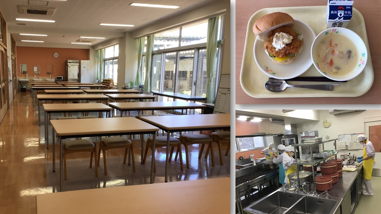 本校は自校給食です。毎日調理員が作りたての給食を提供します。温かくおいしい給食です。