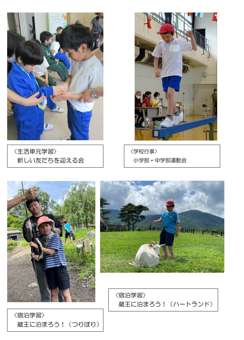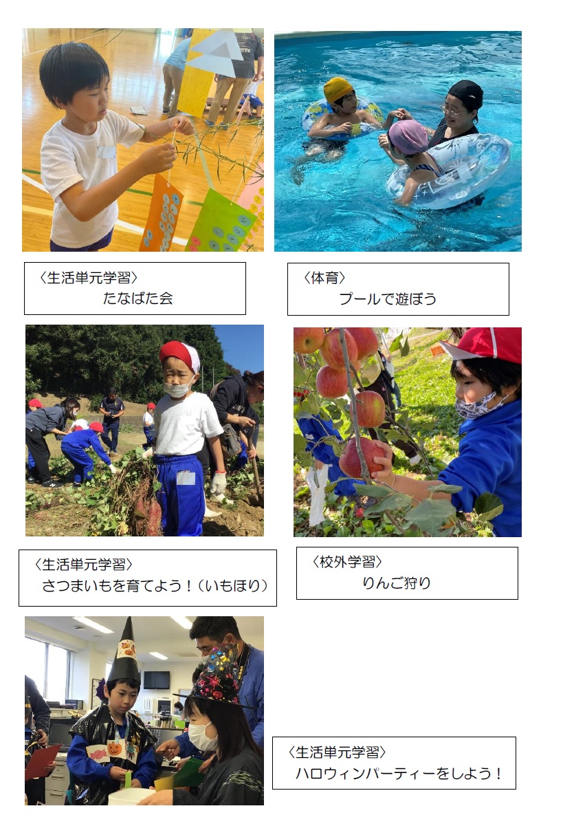 小学部では、「自分でできることを増やす」を目標に日々学習に取り組んでいます。「日常生活の指導」では、着替えや排泄、食事・歯磨き,朝・帰りの会、係活動などを行っています。「遊びの指導」では、児童が意欲的に遊びに取り組むことを通して身体活動を活発にし、仲間との関わりが深められるよう支援しています。また、個々の実態に応じて、学習上・生活上の困難を改善できることを目標とする「自立活動」の学習や、国語・算数・音楽の基本を扱う学習も行っています。また、地域の特色を生かしたりんご狩りや、季節ごとの行事を計画し取り組んでいます。